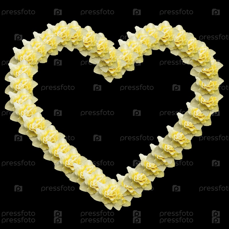Символическое желтое сердце на черном фоне. Контуры сердца выложены цветочными головками цветка нарцисса. Концептуальный символ любви