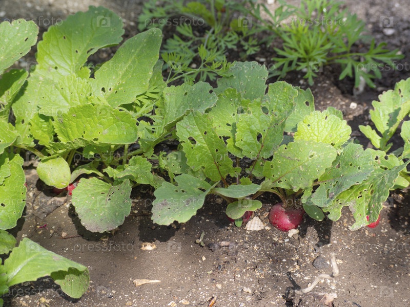 В огороде растет редис. Крупный план экологически чистой красной редьки, растущей на грядке в естественных условиях. Выборочный фокус. Концепция здорового питания