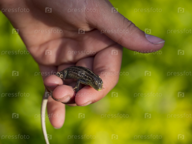 Маленькая ящерица на руке девушки на зеленом фоне