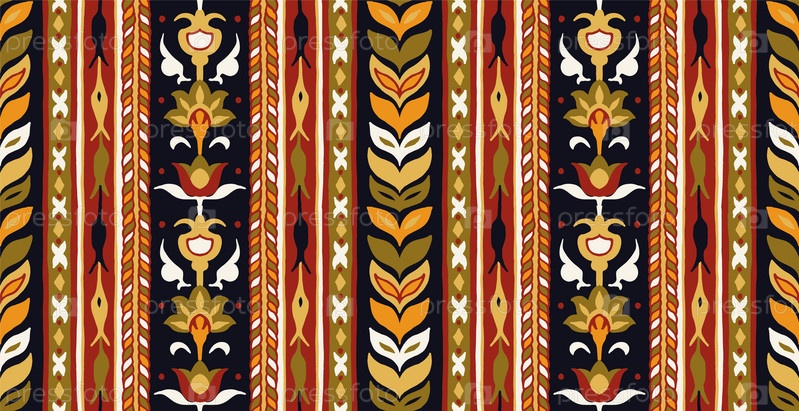 Геометрический дамасский орнамент. Икат границы. Этническая вышивка с листьями и монограммами. Племенная векторная текстура. Бесшовный народный узор в ацтекском стиле. Индийский, скандинавский, цыганский, мексиканский, африканский ковер