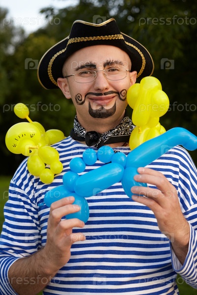 Улыбающийся мужчина с нарисованной бородой и усами в костюме пирата с воздушными шариками