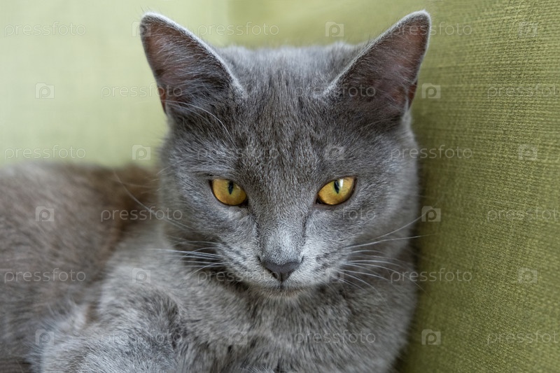 Серый кот с желтыми глазами лежит на сером фоне. Всемирный день кошек
