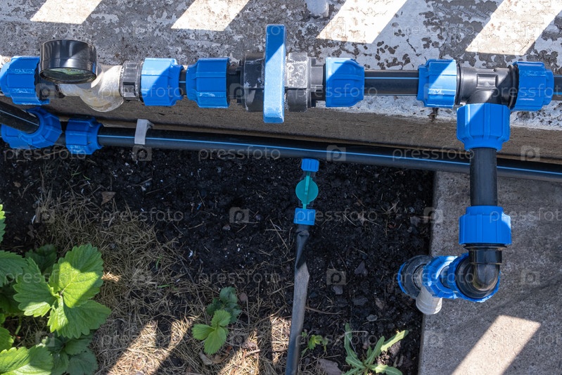 Рассаду растений выращивают на грядках с автоматическим поливом или системой капельного полива в домашнем огороде. Шланг для полива и орошения