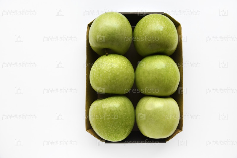 Шесть зеленых яблок на картонной подложке на белом фоне. Вкусные зеленые яблоки крупным планом