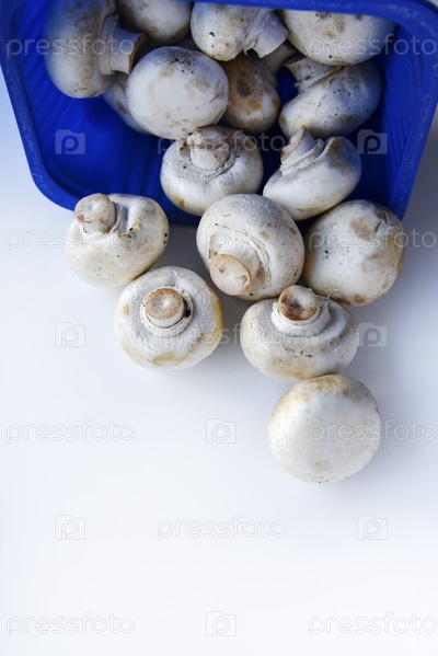 Вываленные белые грибы. Пучок шампиньонов выпал из упаковки. Разбросанные грибы на белом фоне