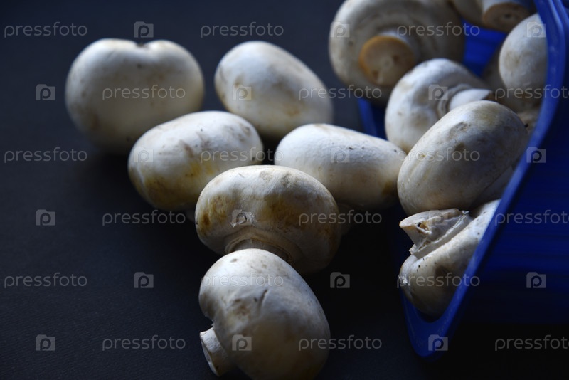 Вываленные белые грибы. Пучок шампиньонов выпал из упаковки. Разбросанные грибы на черном фоне