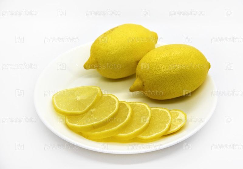 Желтые спелые и сочные плоды лимонов на белой тарелке. Нарезанные лимоны крупным планом. Вкусные лимоны к чаю. Ломтики лимона