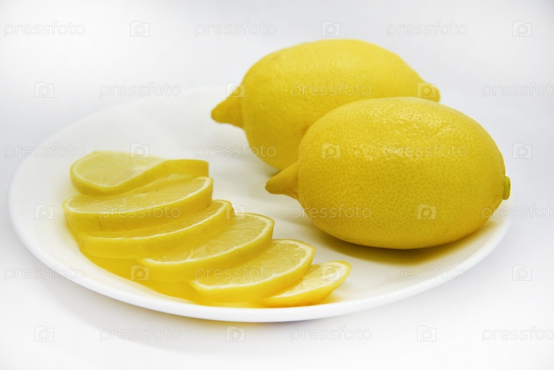 Желтые спелые и сочные плоды лимонов на белой тарелке. Нарезанные лимоны крупным планом. Вкусные лимоны к чаю. Ломтики лимона