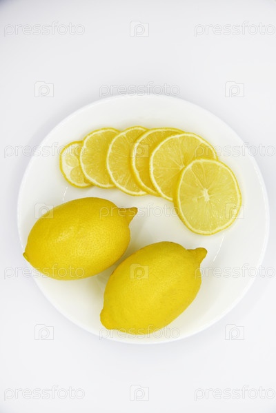Желтые спелые и сочные плоды лимонов на белой тарелке. Нарезанные лимоны крупным планом. Вкусные лимоны к чаю. Ломтики лимона