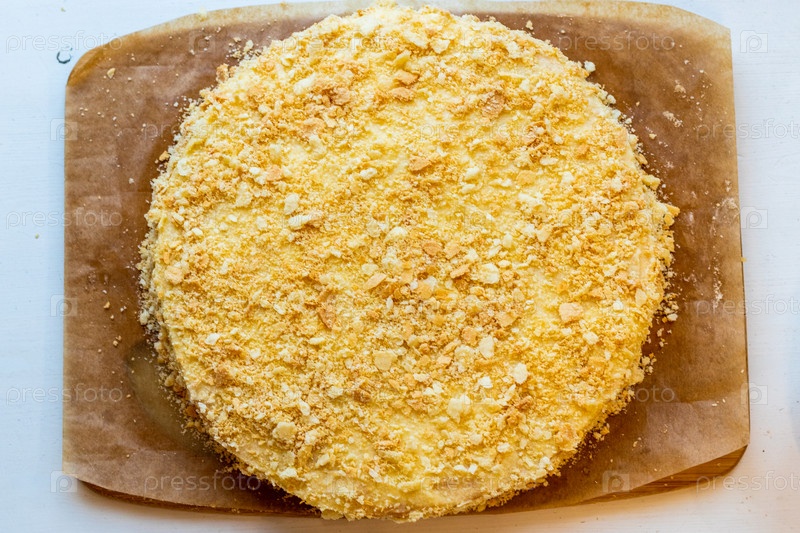 Слоеный круглый торт Наполеон с заварным кремом и посыпанный крошкой