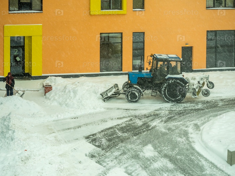 Трактор чистит дорогу от снега