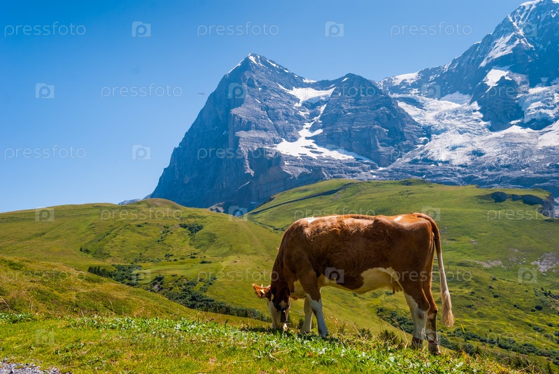 Корова на горном пастбище на фоне пика Эйгер. Гриндельвальд Бернские Альпы Швейцария Европа