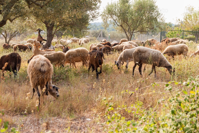 Стадо овец и коз, пасущихся среди оливковых деревьев на побережье Греции