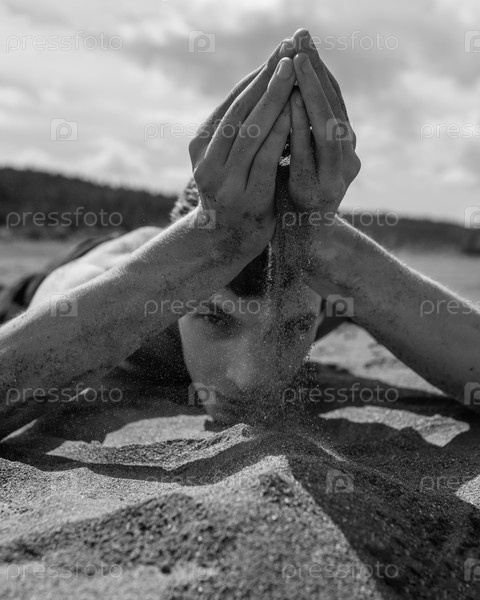 Мужчина лежит на животе и сыпет песок через руки в пустыне