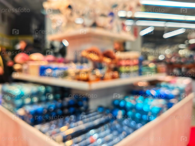 Размытый рождественский супермаркет. Продажа праздничных рождественских аксессуаров в розничном магазине. Размытый фон в магазине. Выборочный фокус