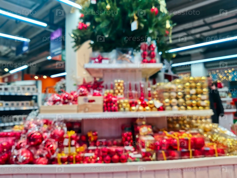 Размытый рождественский супермаркет. Продажа праздничных рождественских аксессуаров в розничном магазине. Размытый фон в магазине. Выборочный фокус