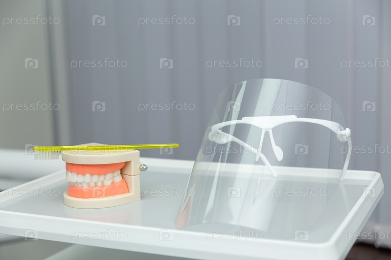 Модель челюсти чистых зубов и желтая зубная щетка на сером фоне