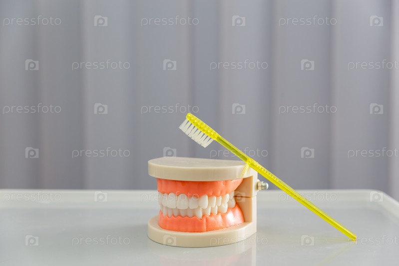 Модель челюсти чистых зубов и желтая зубная щетка на сером фоне