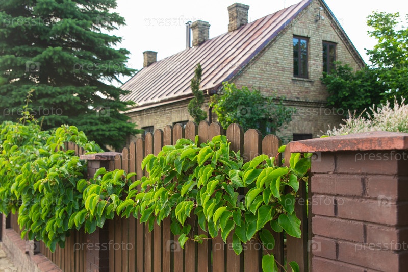 Вид на кирпичный частный дом и забор, покрытый зелеными растениями