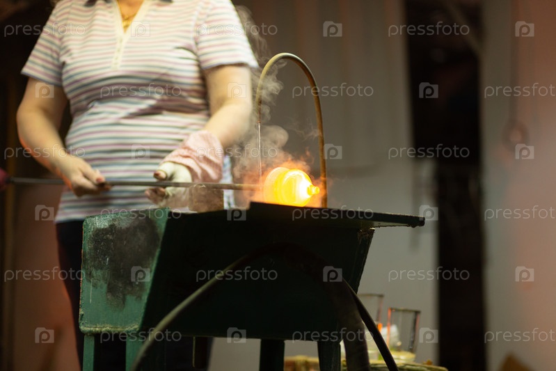 Стеклодув работает над изготовлением стеклянных ваз и стаканов. Охлаждение раскаленного изделия водой. В производстве особо сложных изделий одновременно могут быть задействованы до 20 рабочих