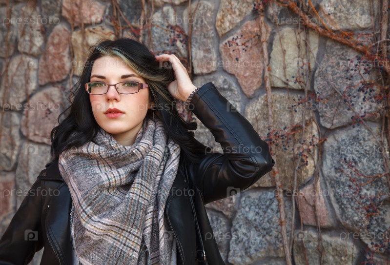 Портрет молодой брюнетки в черной куртке, стоящей у стены старого каменного замка в осенний день