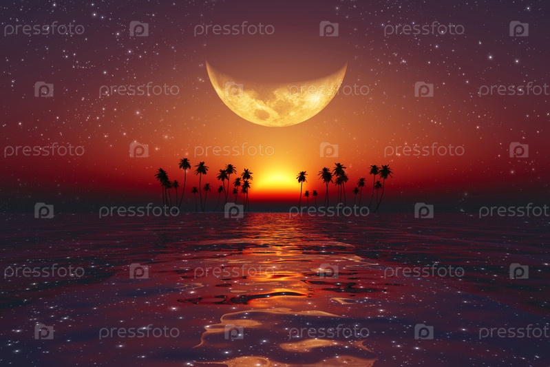 Большая желтая луна над красным закатом