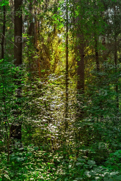 Пейзаж дикого хвойного леса в летний день