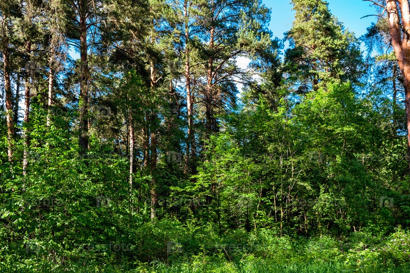 Пейзаж дикого хвойного леса в летний день