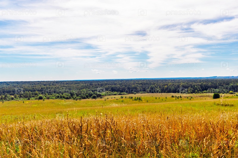 Пейзаж с полем и лесом на горизонте летом