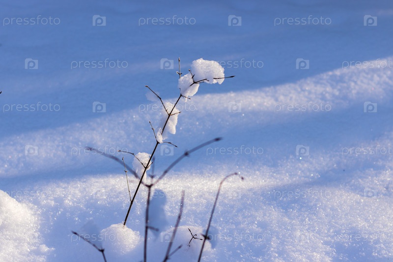 Зимний пейзаж, небольшой куст, покрытый свежим пушистым снегом
