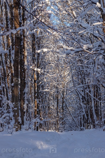 Лыжня для беговых лыж в зимнем лесу с большим количеством снега