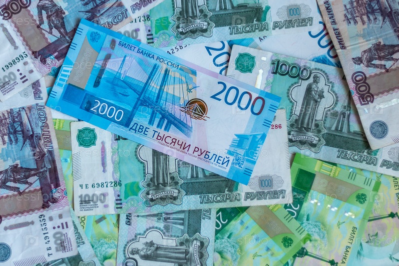 Российский рубль, деньги, банкноты разных номиналов. Банкноты российских денег, фон, текстура