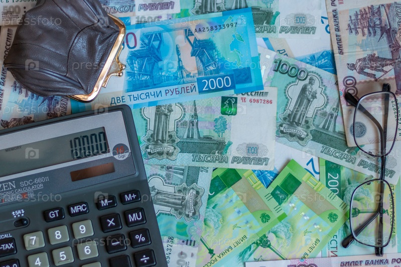 Российские рубли, очки, кошелек с мелкими монетами и калькулятор на столе