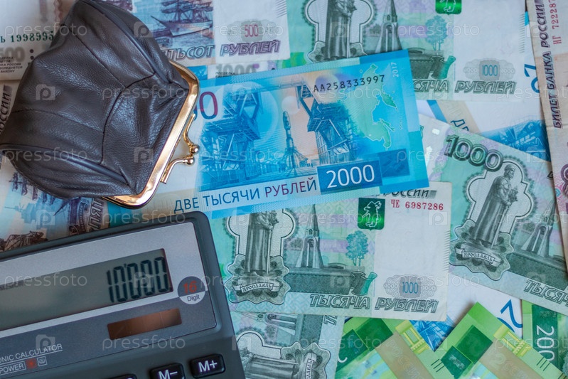 Российские рубли, кошелек с мелкими монетами и калькулятор на столе