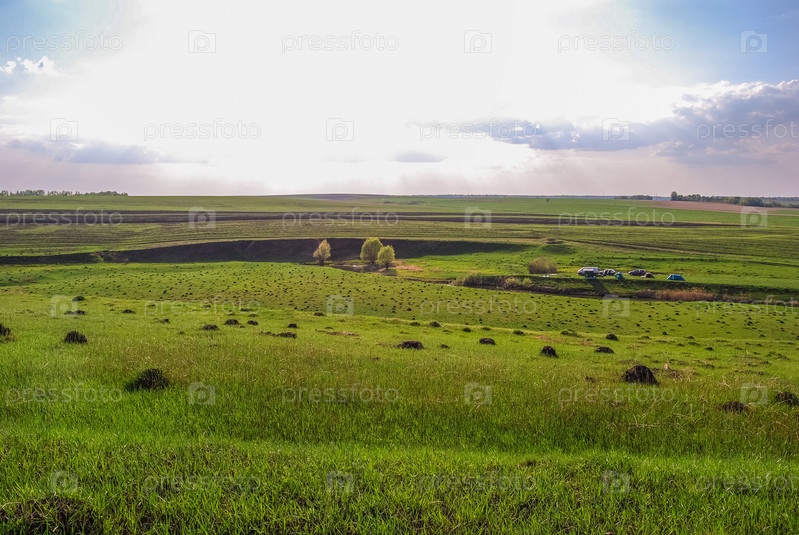 Весенний пейзаж с полями, зелеными холмами, белыми облаками на фоне голубого неба. Тульская область, Россия