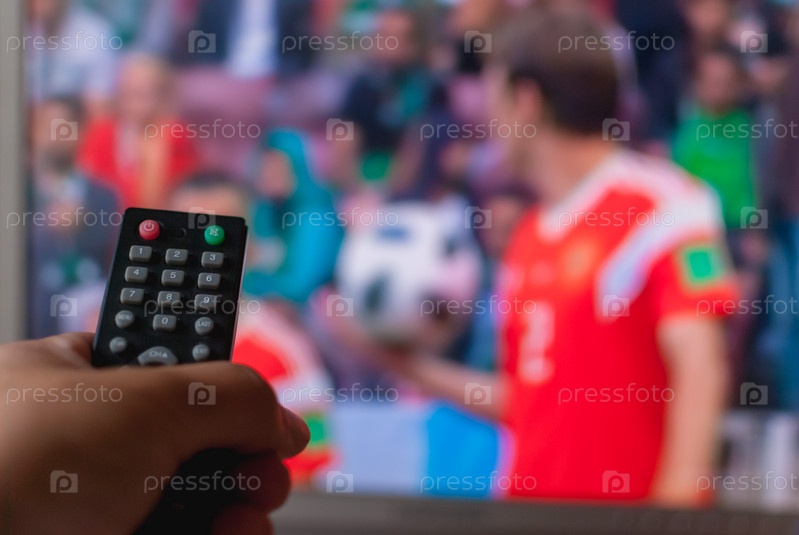 Рука держит пульт дистанционного управления телевизором против размытого экрана, на котором транслируется футбол