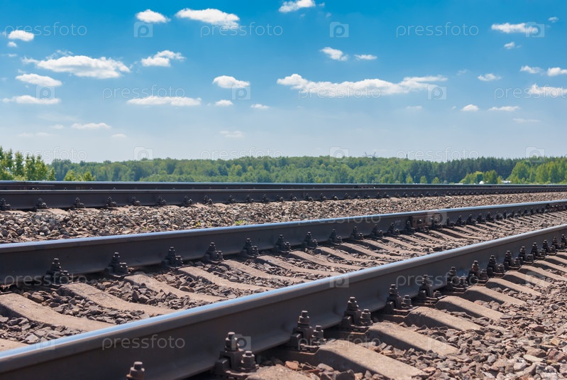Железнодорожный путь двухпутной железной дороги на фоне синего. Россия