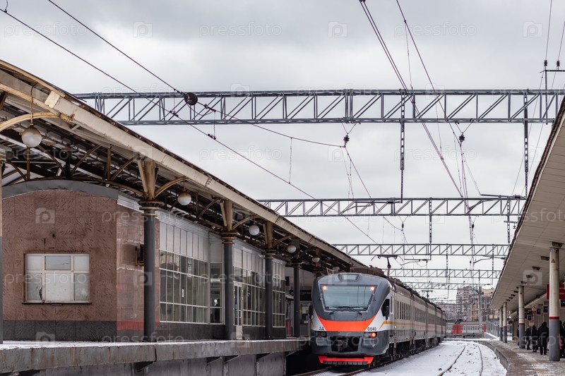Железнодорожная станция современный красный скоростной пригородный поезд зимой. Курский вокзал, Москва, Россия