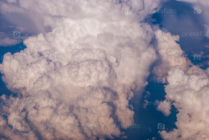 Вид сверху на облака и голубое небо из окна самолета, фон природы