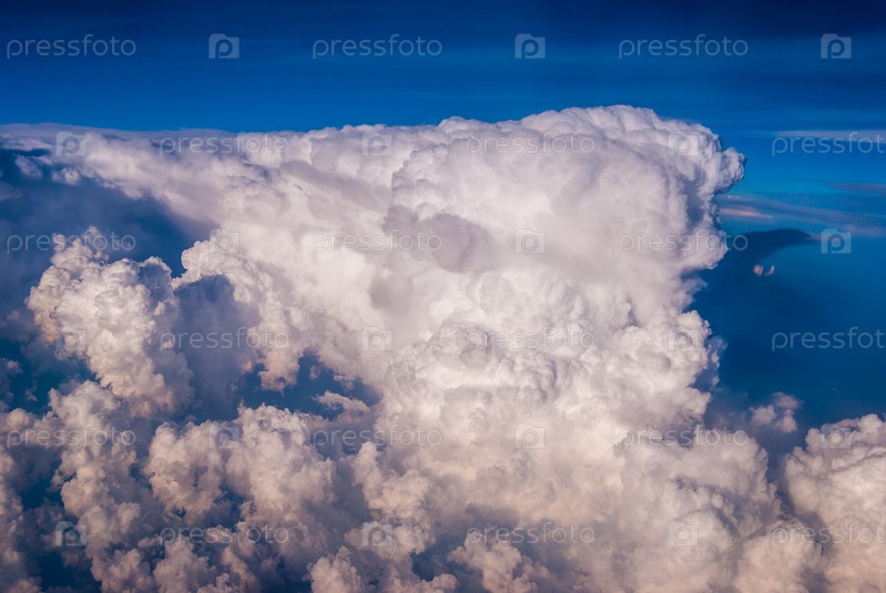 Вид сверху на облака и голубое небо из окна самолета, фон природы