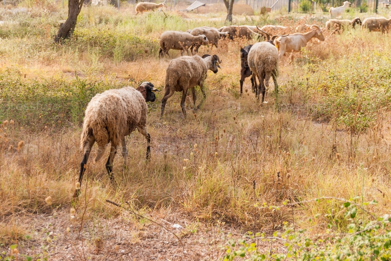 Стадо овец и коз, пасущихся среди оливковых деревьев на побережье Греции