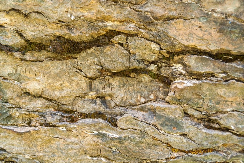 Крупный план серых скал, покрытых мхом, узор сколов, трещин. Гриндельвальд, Швейцария