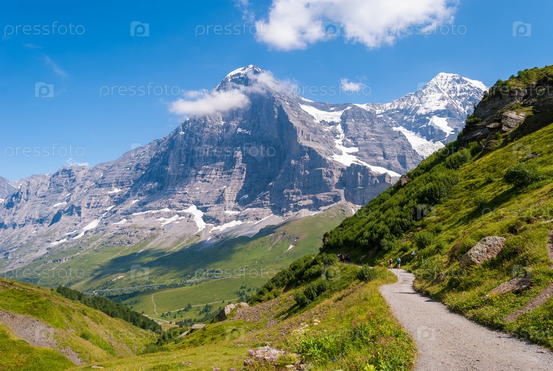 Походная тропа на фоне потрясающей альпийской панорамы северной стены пика Эйгер, Гриндельвальд, Бернские Альпы, Швейцария, Европа