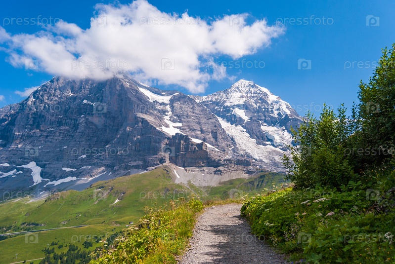 Походная тропа на фоне потрясающей альпийской панорамы северной стены пика Эйгер, Гриндельвальд, Бернские Альпы, Швейцария, Европа