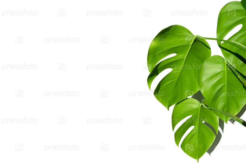 Растение монстера в белом горшке на белом изолированном фоне. Концепция минимализма. Листья монстеры деликатесной или швейцарский сырный завод на фоне тропических листьев в горшке. резкие тени