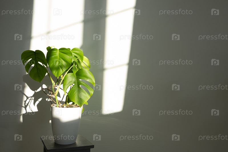 Цветок монстра в белом горшке на сером фоне Концепция минимализма. Монстера делициоза или швейцарская сыровая фабрика на фоне тропических листьев в горшке Дневный свет, резкие тени