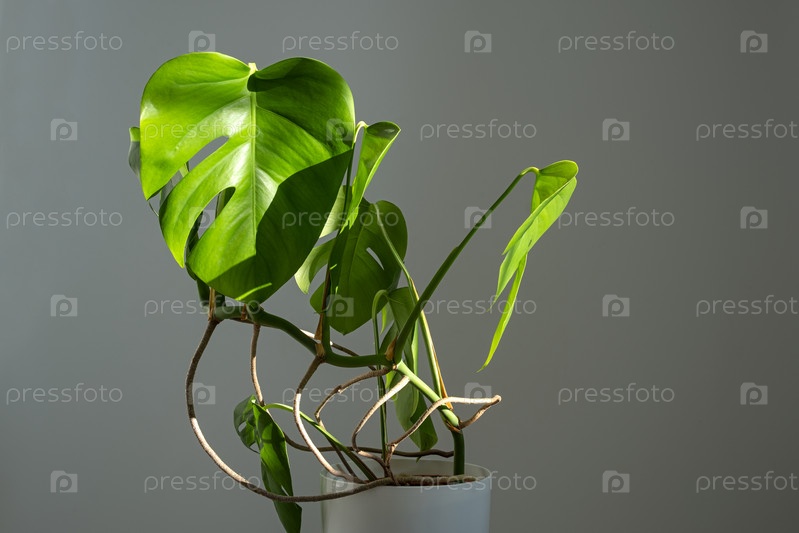 Цветок монстра в белом горшке на сером фоне Концепция минимализма. Монстера делициоза или швейцарская сыровая фабрика на фоне тропических листьев в горшке Дневный свет, резкие тени