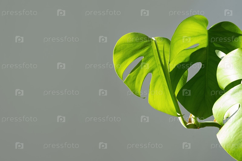 Цветок монстра в белом горшке на сером фоне Концепция минимализма. Монстера делициоза или швейцарская сыровая фабрика на фоне тропических листьев в горшке Дневный свет, резкие тени