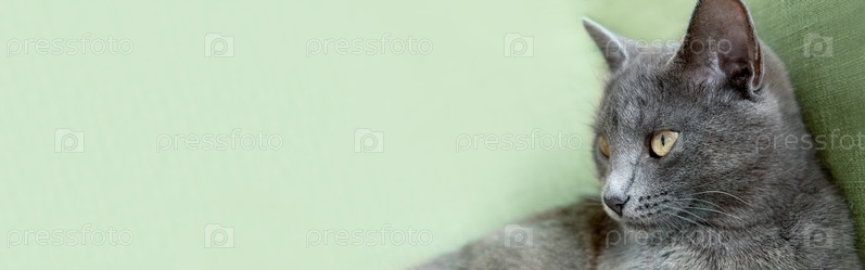 Серый кот с желтыми глазами лежит на зеленом фоне. Всемирный день кошек