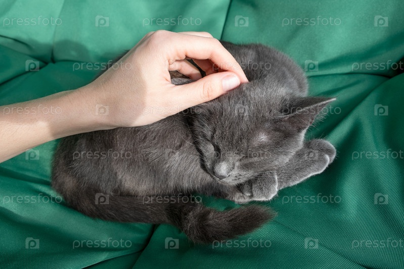 Крупным планом портрет серого кота с женской рукой на зеленом фоне. Хозяйка нежно гладит кошку. Концепция ветеринарной клиники или корма для животных
